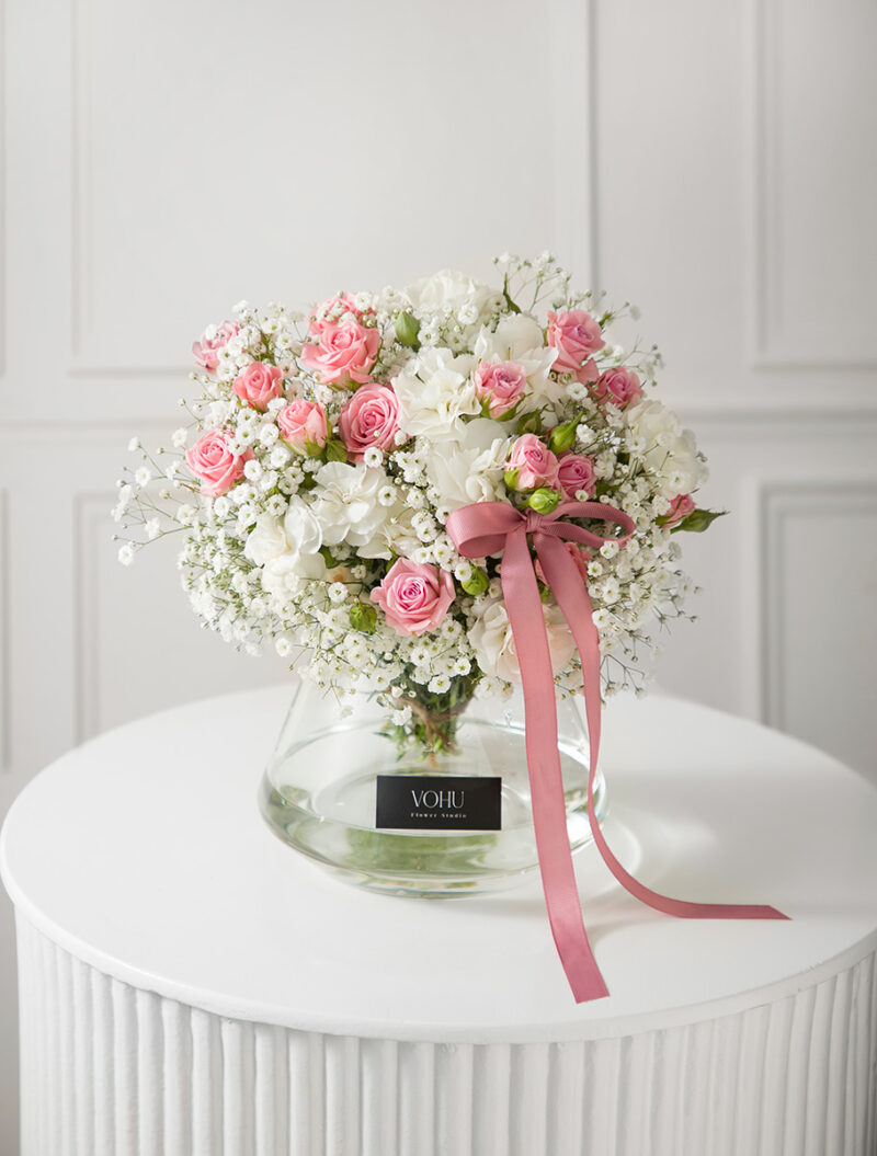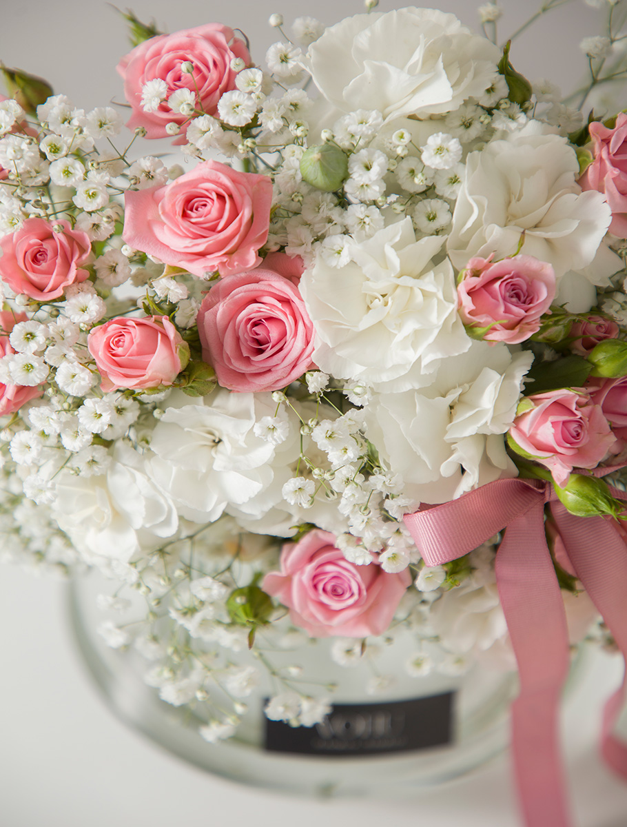 جارگل شامل: گل رز مینیاتوری صورتی، گل میخک سفید، گل ژیپسوفیلا ( عروس )