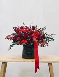 باکس گل یلدایی شامل : گل رز هلندی، گل رز مینیاتوری ، انار ، فالنامه ، میوه خشک ، اجیل ، بلوط ، دارچین ، گل ناندینا برگ اوکالیپتوس