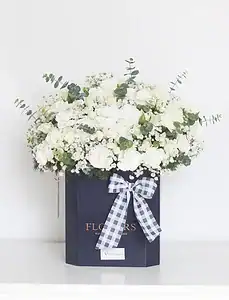 باکس گل شامل گلهای : گل رز ، گل رز مینیاتوری ، گل میخک، گل لیسیانتوس ، برگ اوکالیپتوس