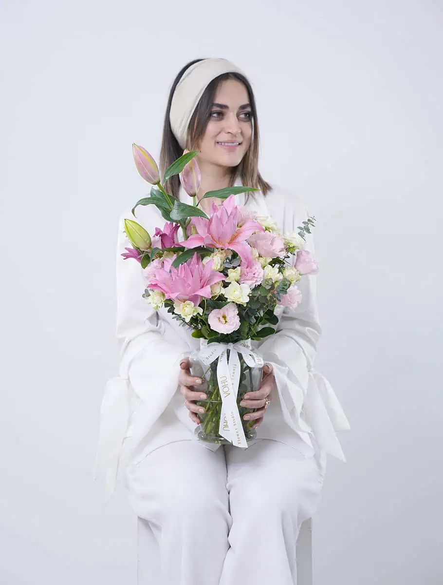 جار گل شامل گل های : گل لیلی رز صورتی ،گل لیسینتوس ،برگ اوکالیپتوس
