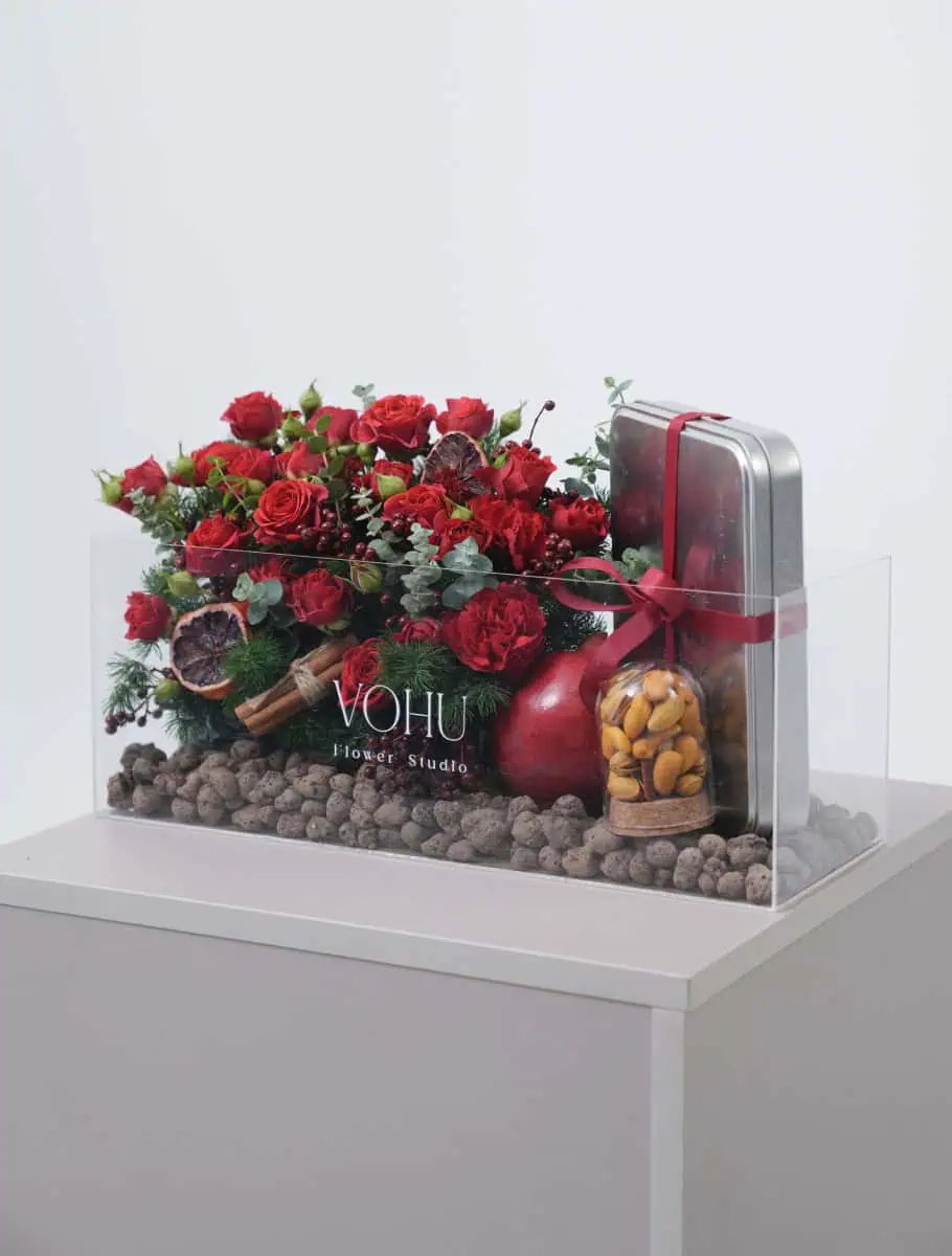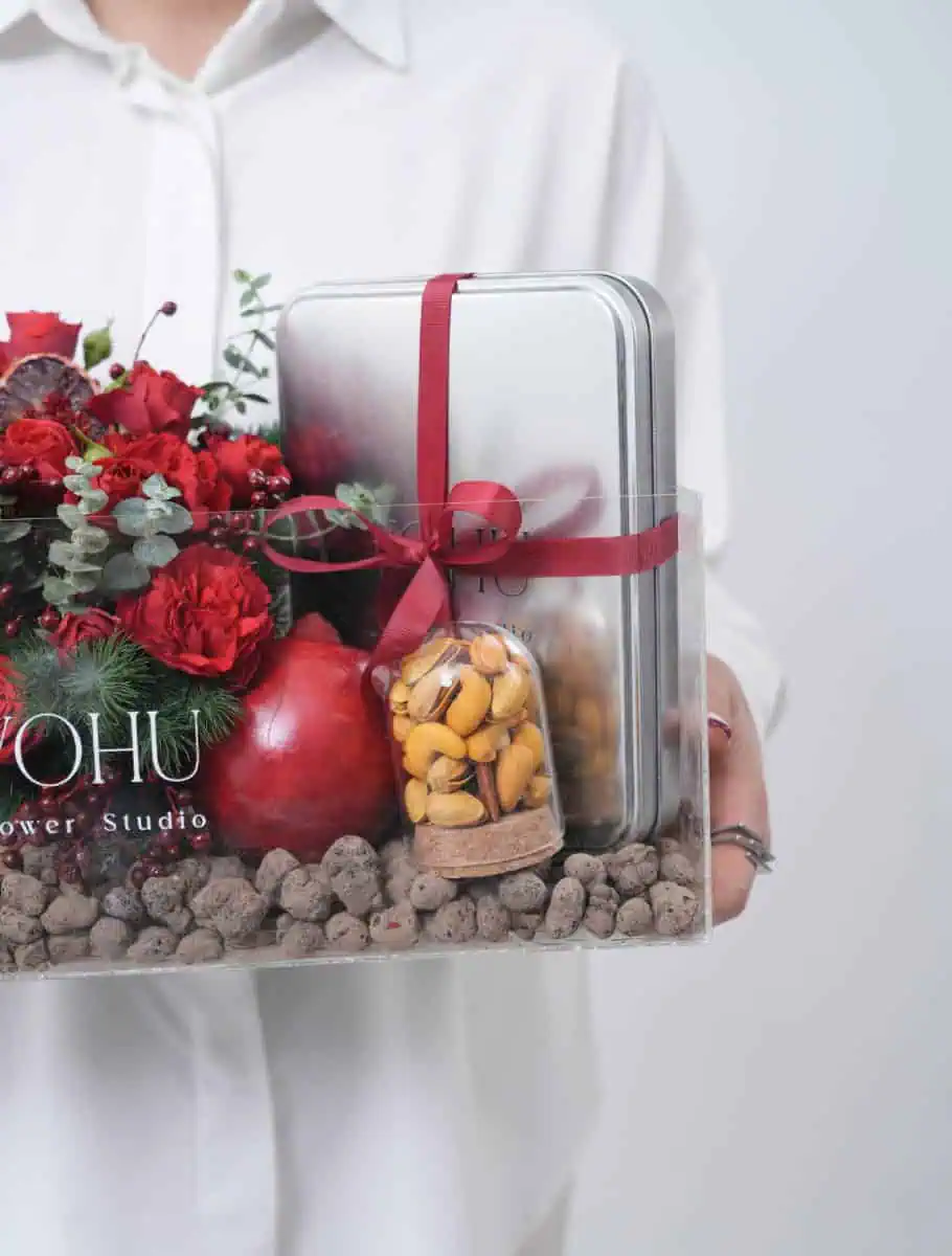 باکس گل شامل: گل رز مینیاتوری قرمز،گل میخک قرمز، برگ اوکالیپتوس، آجیل، چوب دارچین، انار،به همراه میوه خشک