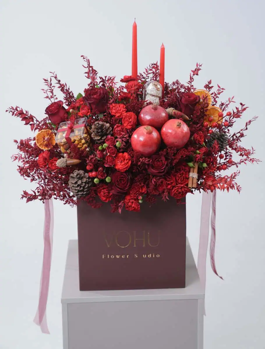 باکس گل شامل: گل رز قرمز هلندی،گل رز مینیاتوری قرمز،گل میخک قرمز،گل خشک، کاج ،انار، آجیل،باسلوق