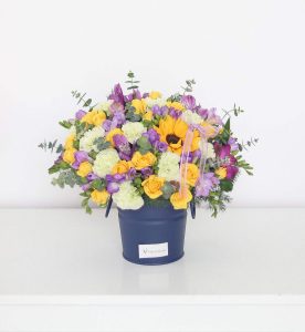 باکس گل شامل گلهای : گل رز یاسی ،گل لیسیانتوس ، گل قلمفور ، گل مخلصه ، برگ اوکالیپتوس