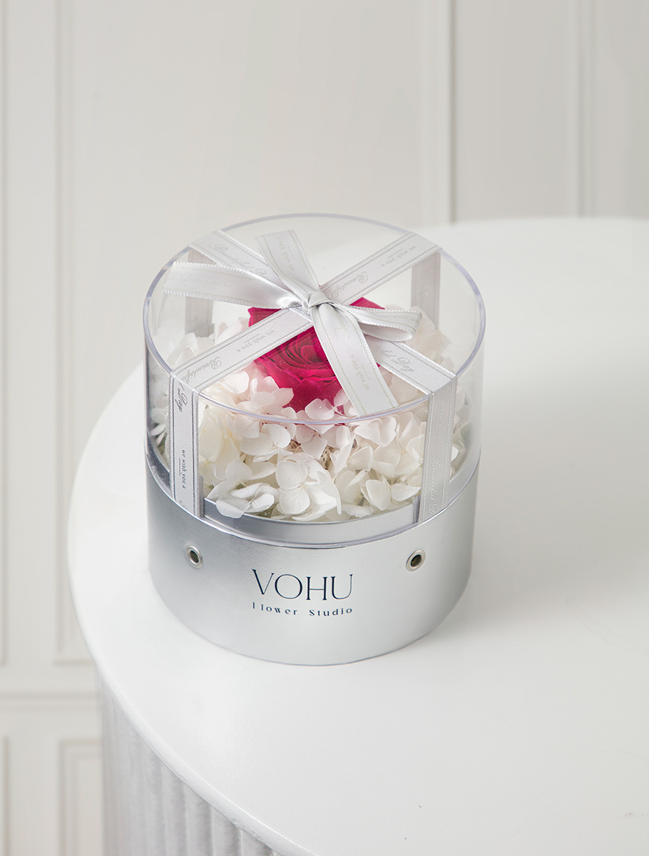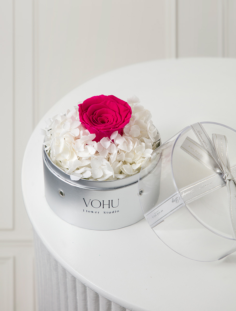 باکس گل شامل گلهای : گل رز جاودان سرخابی ، گل هورتانسیا جاودان